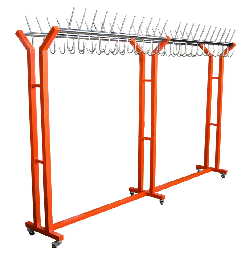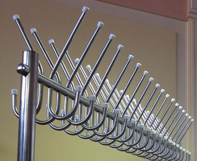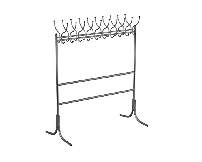 - Многосекционные – представляют собой стойку на двух опорах, с поперечной перекладиной. Может дополнительно комплектоваться поворотными элементами, для увеличения количества крючков. Целесообразно устанавливать в местах большого скопления людей.