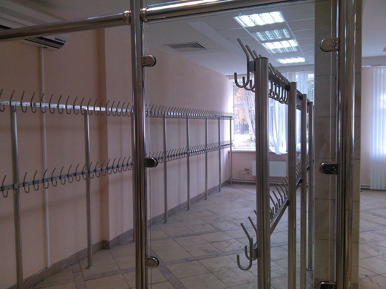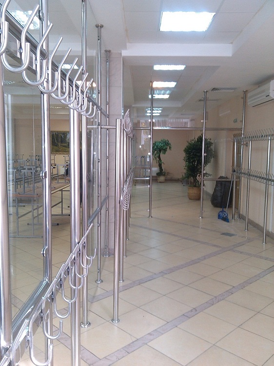 Стойки гардеробных вешалок, по желанию заказчика, в любой момент можно модернизировать или добавить дополнительные элементы – крючки для одежды, поворотные детали, легкие перекладины для обуви и головных уборов.