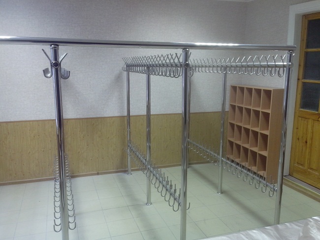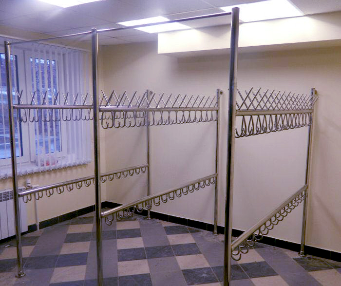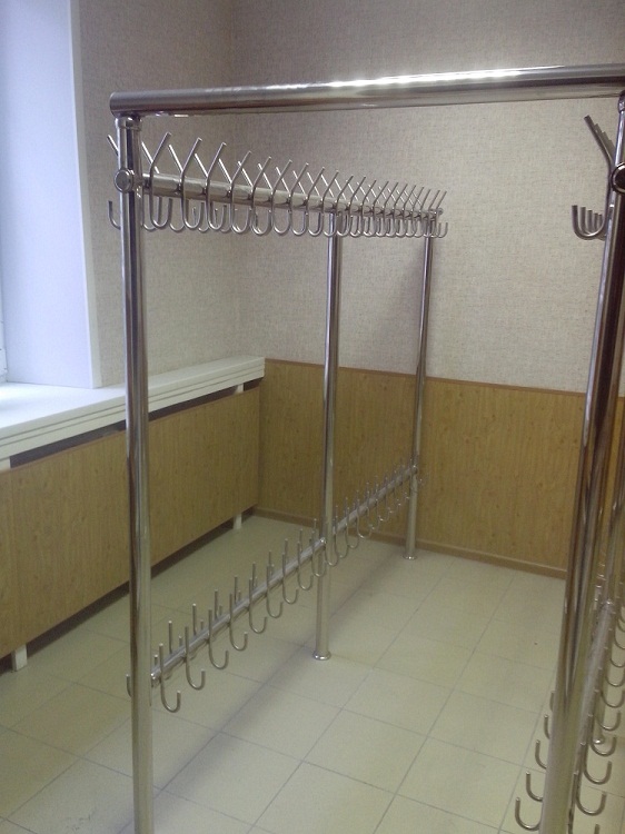 Секции гардеробного оборудования комплектуется стойками с перемычками, на которых располагаются крючки. Секции могут быть навесные и напольные, стационарные и мобильные. Изготавливается с использованием различных станков для точной нарезки труб, загиба, шлифовки и полировки конструкций. Имеет стойкость к влаге и коррозии, выполняются из нержавеющей стали.