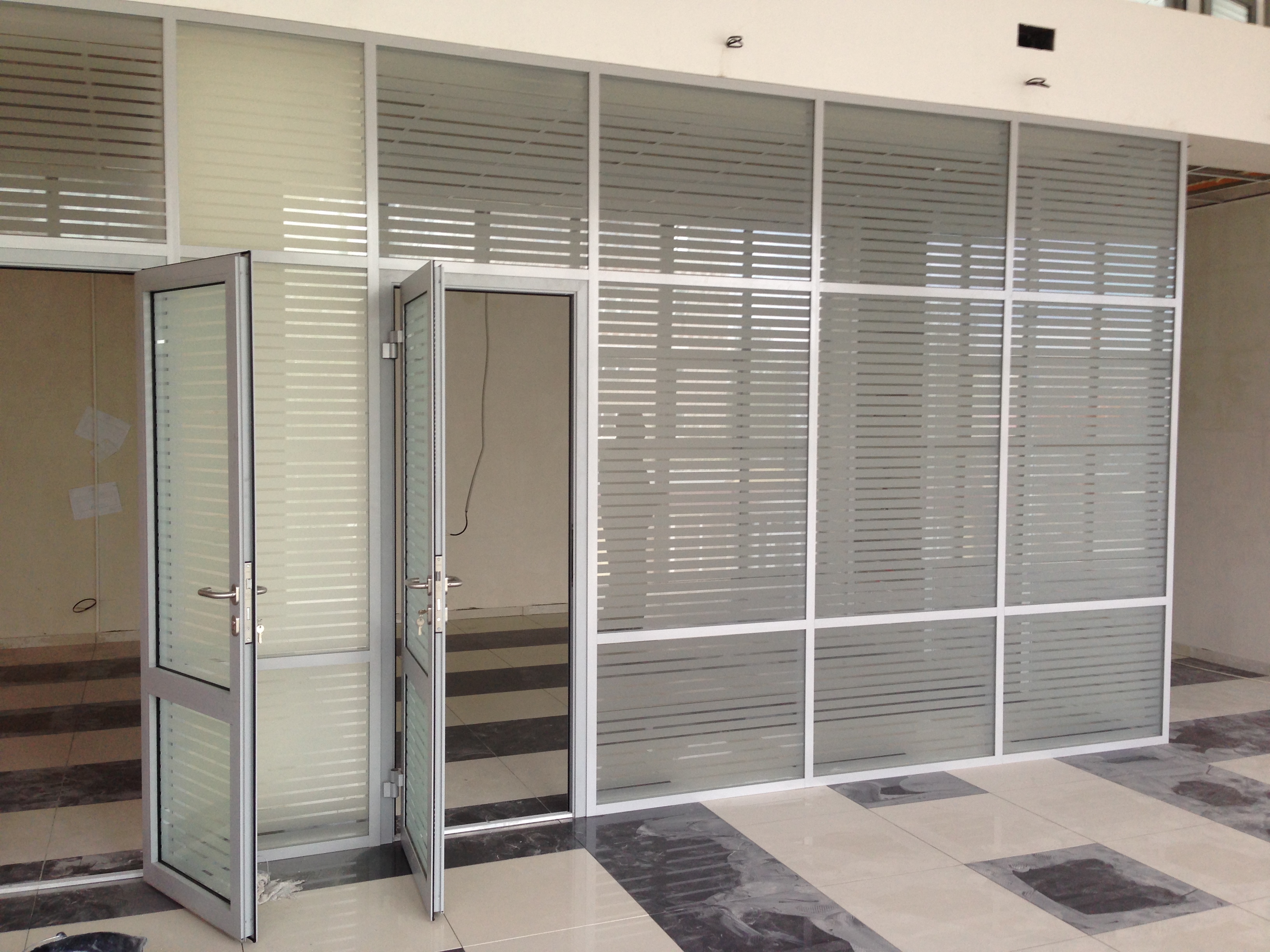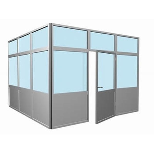 Специальные алюминиевые перегородки крепятся к полу и потолку, а профильные зажимы обеспечивают максимальное прилегание стекла к алюминиевой конструкции. Толщина стекла в модульных каркасах из алюминиевого профиля составляет 8-12 мм.