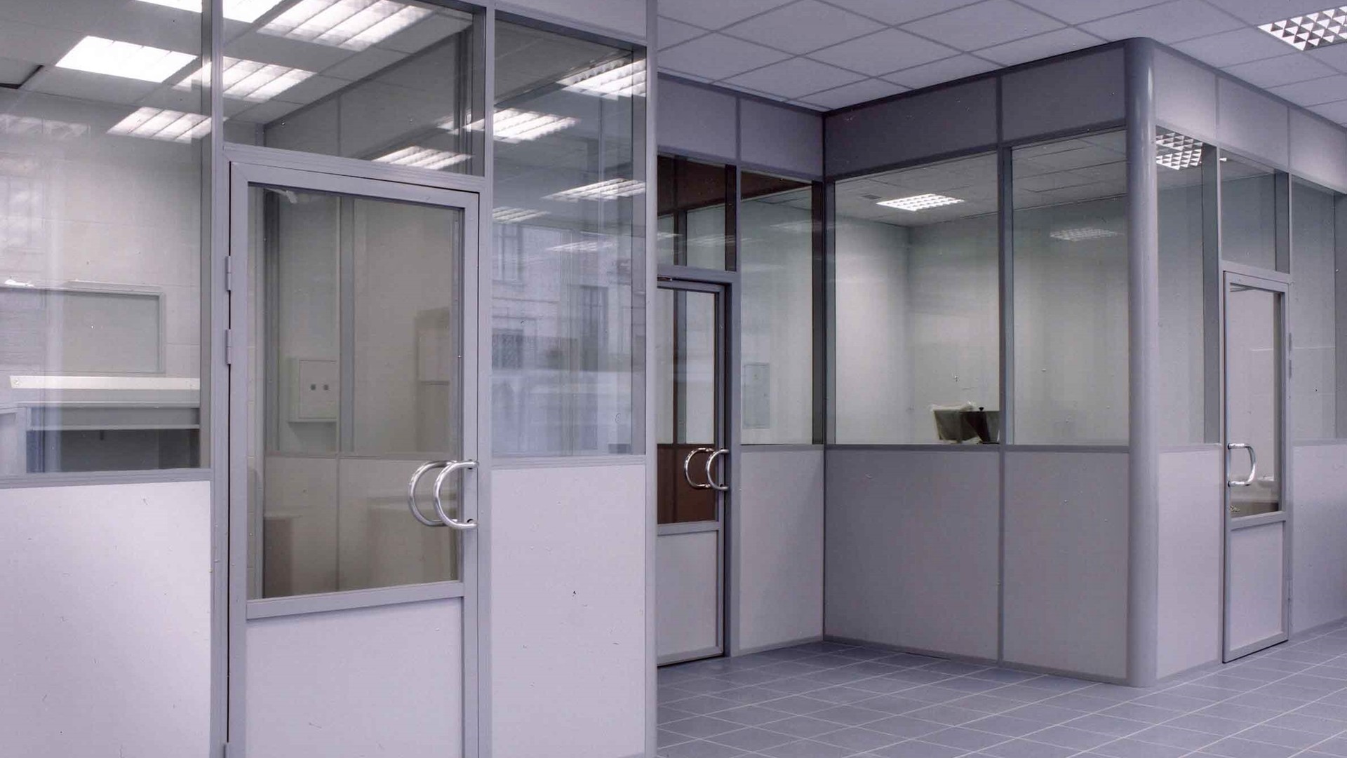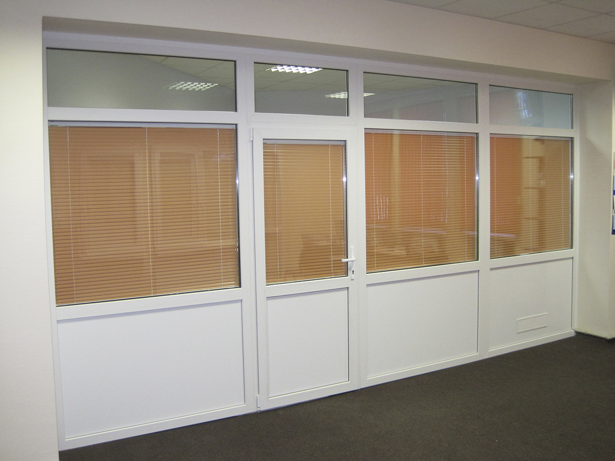 Для отделения рабочих мест в большом помещении используются армированные ПВХ – профили со стеклом или однокамерным стеклопакетом.