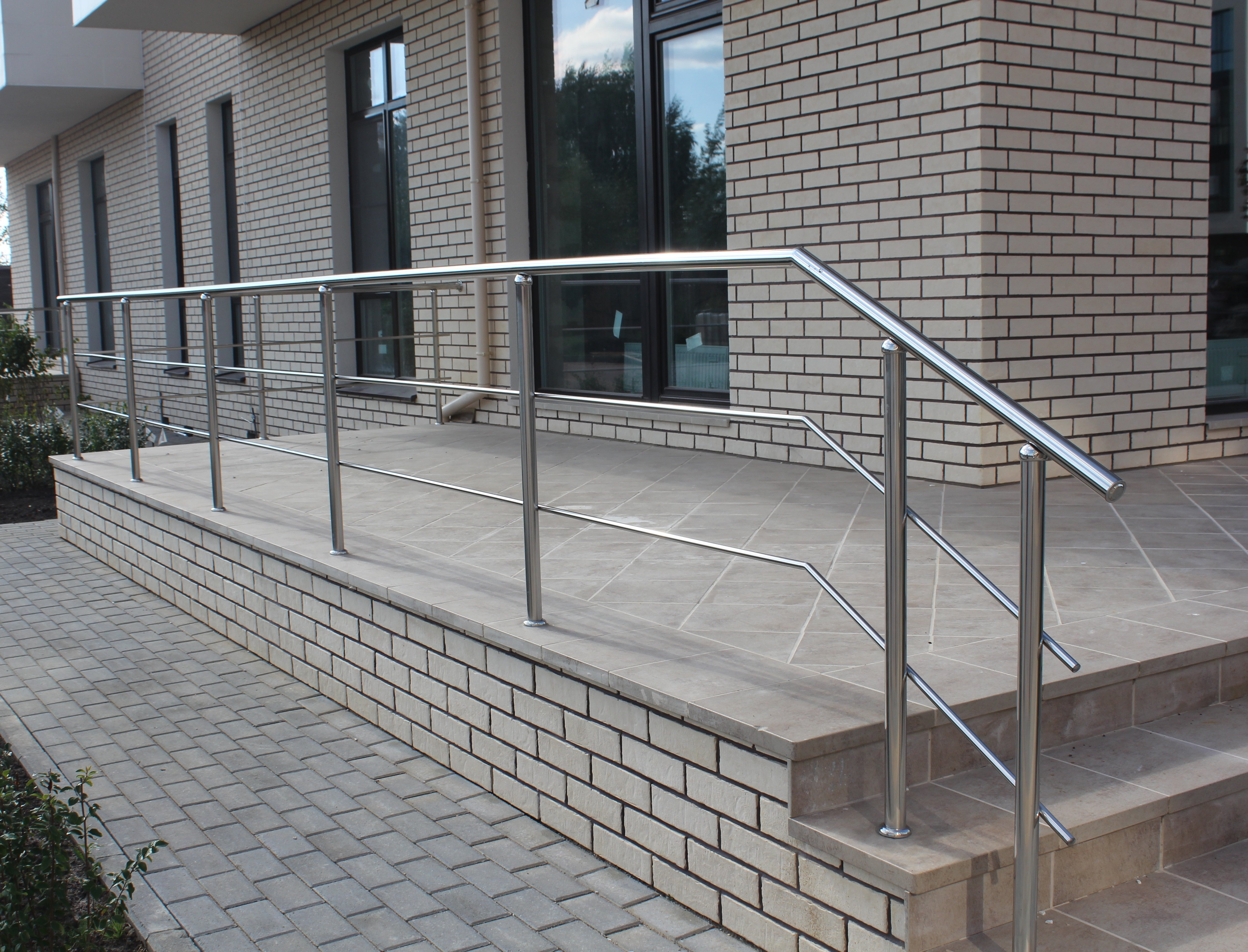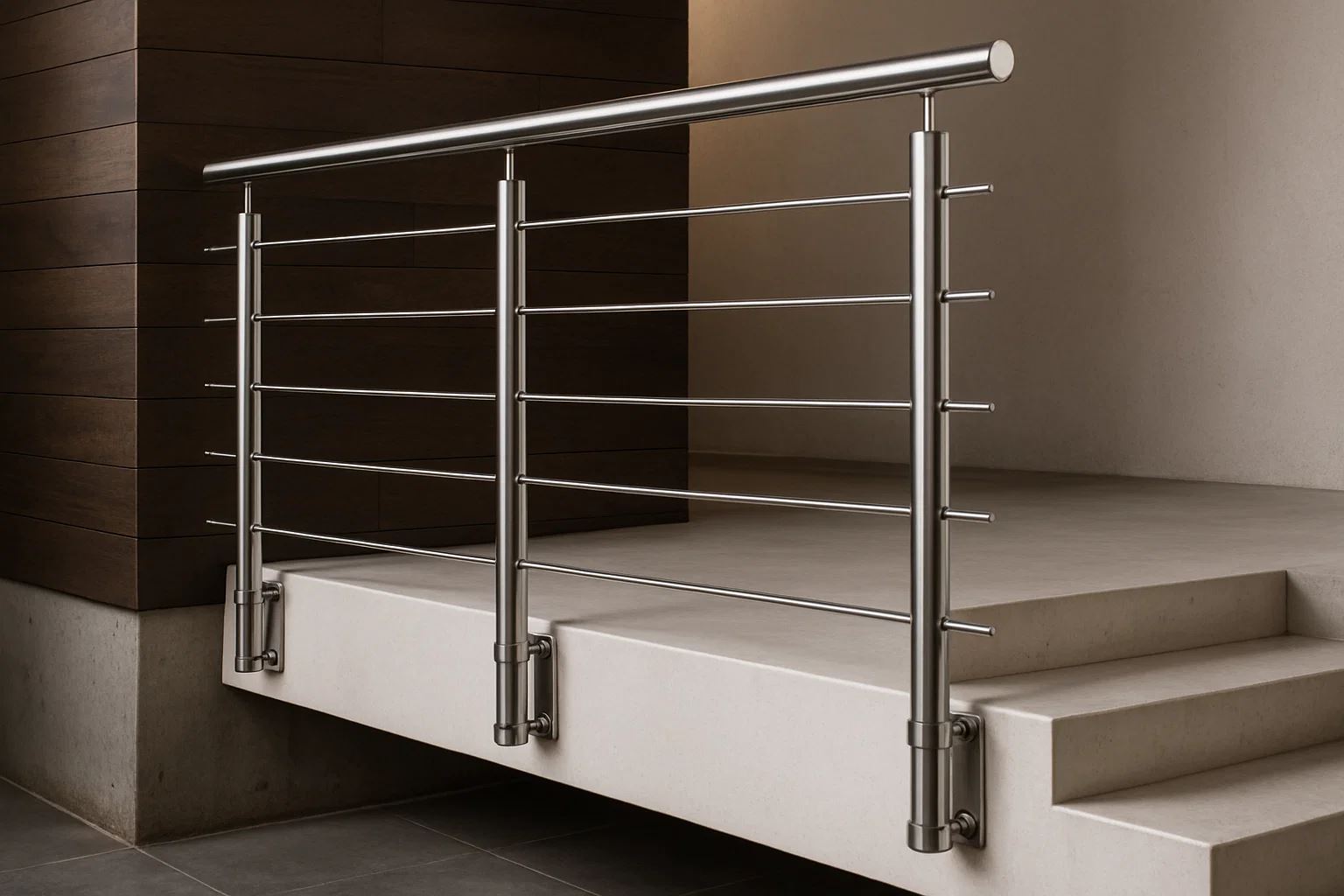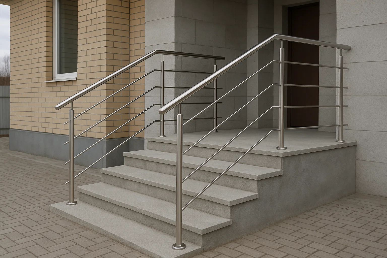 Ограждения с двумя ригелями обеспечивают оптимальную безопасность при подъеме и спуске, сохраняя при этом лёгкость и аккуратный внешний вид. Все элементы изготавливаются из качественной нержавеющей стали марки AISI 304 или 201, что обеспечивает стабильную геометрию и привлекательный блеск поверхности на долгие годы.
