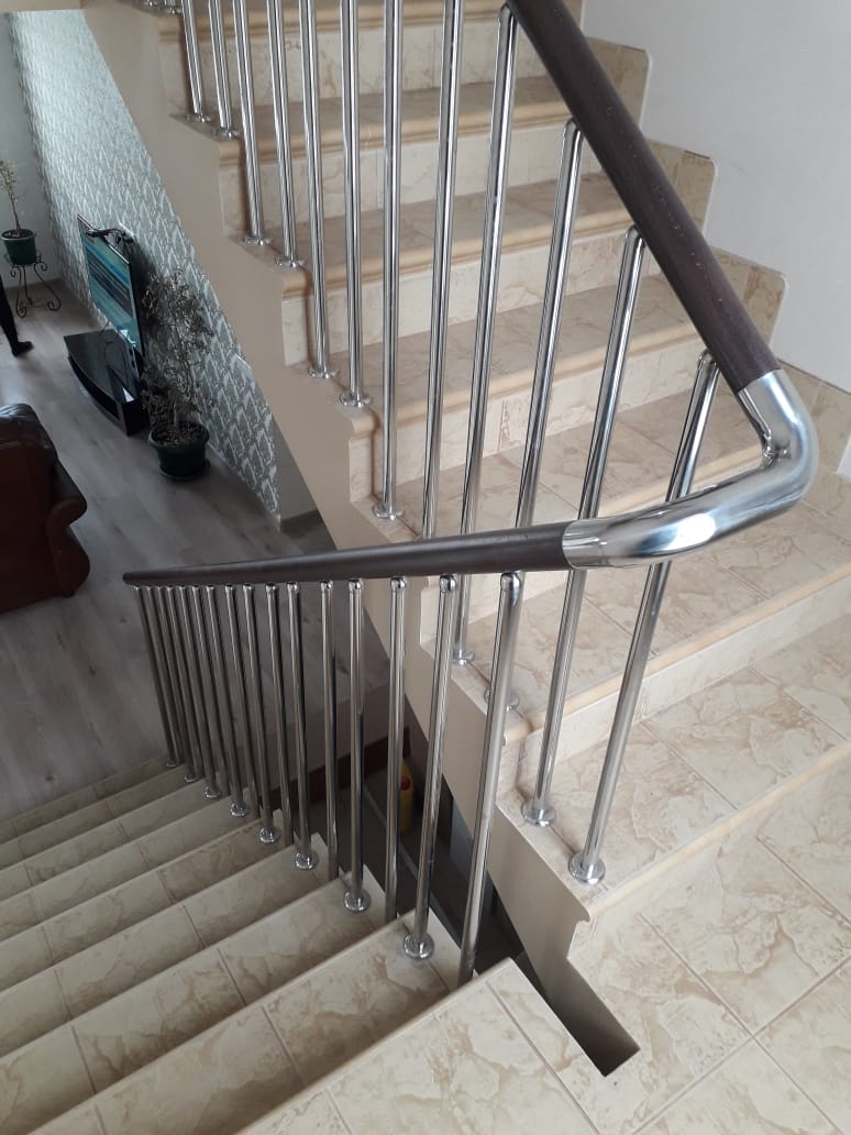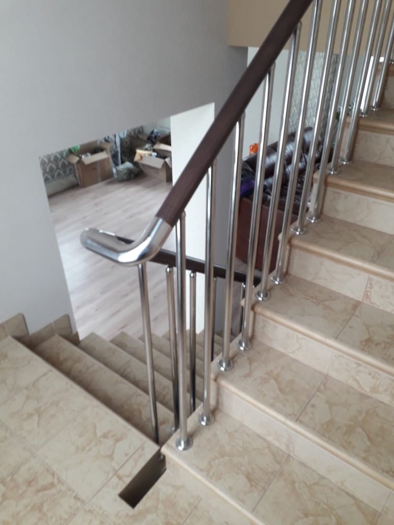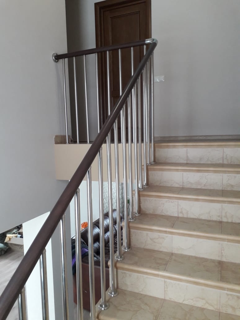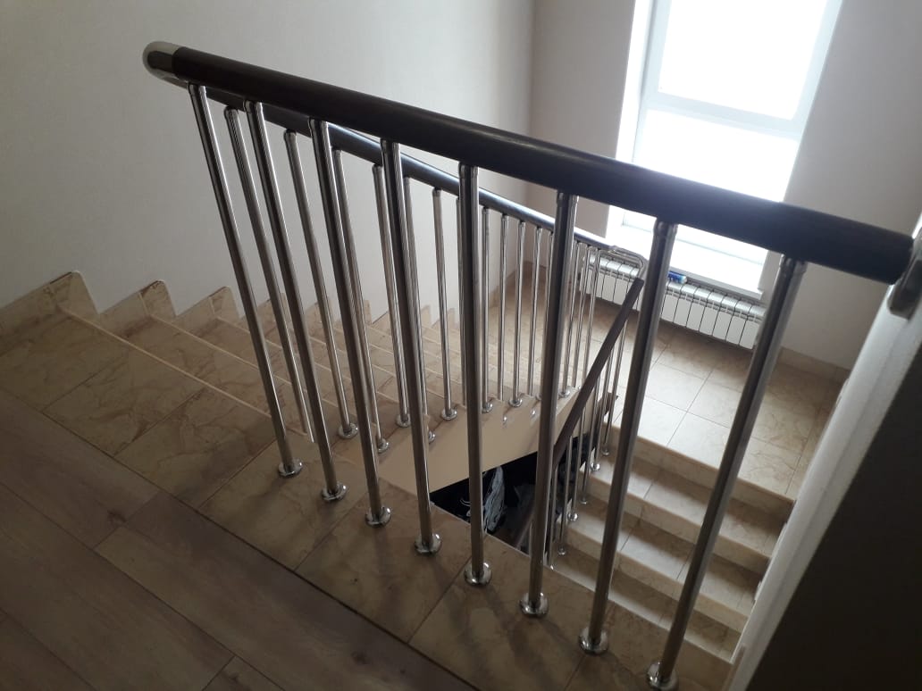 Стойки выполнены из нержавеющей трубы, диаметром 25 мм, шаг стоек 150 мм. Поручень - бук, с вставками из нержавеющей стали.