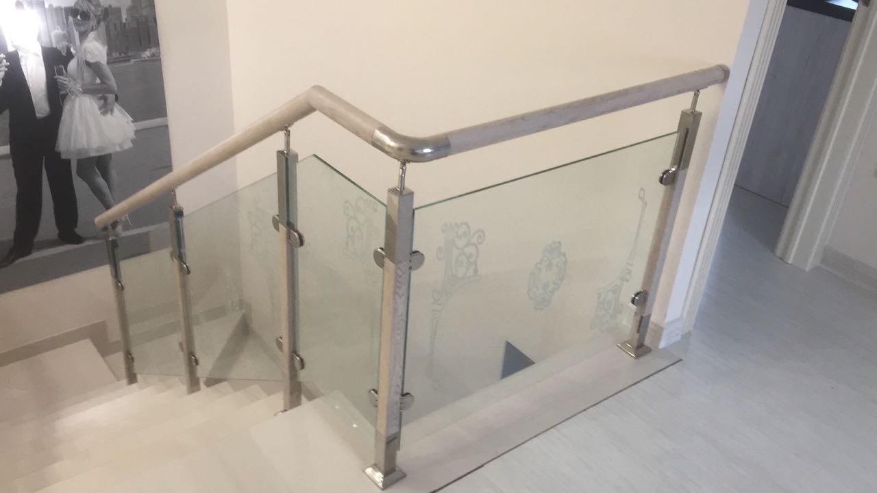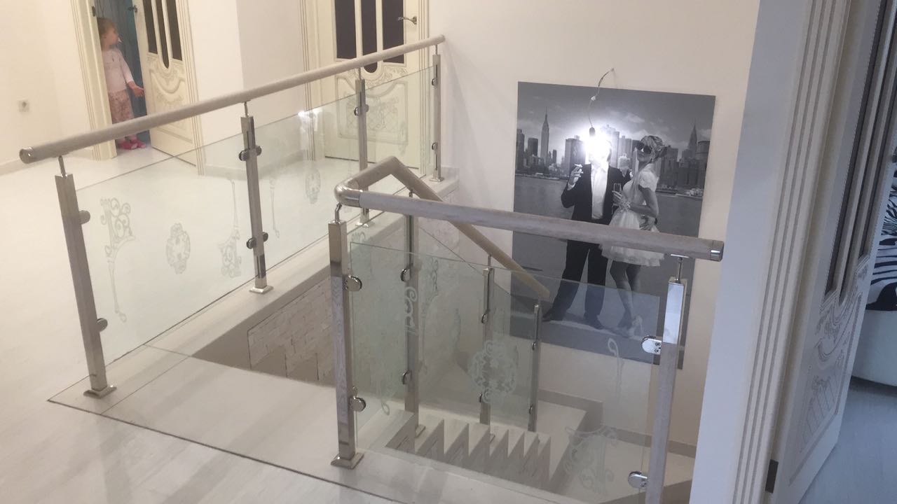 Комбинированные ограждения для коттеджа в г. В.Пышма. Стойки комбинированные с деревянным заполнением, из бука. Поручень так же бук. Заполнение стекло с фотопечатью.