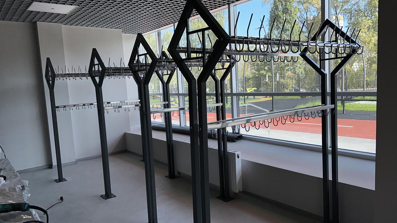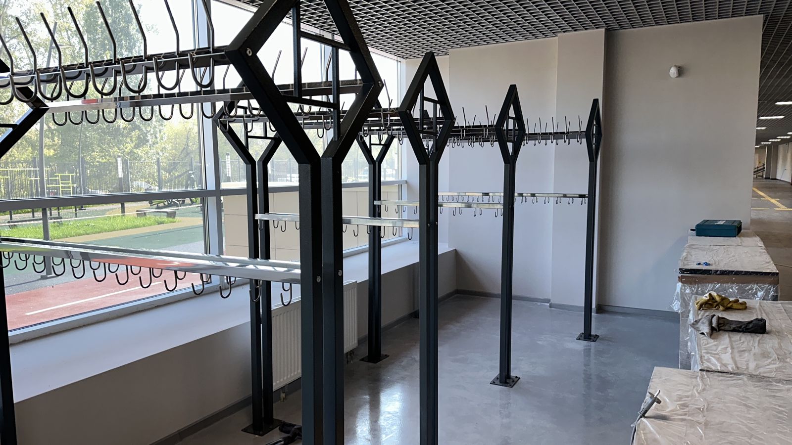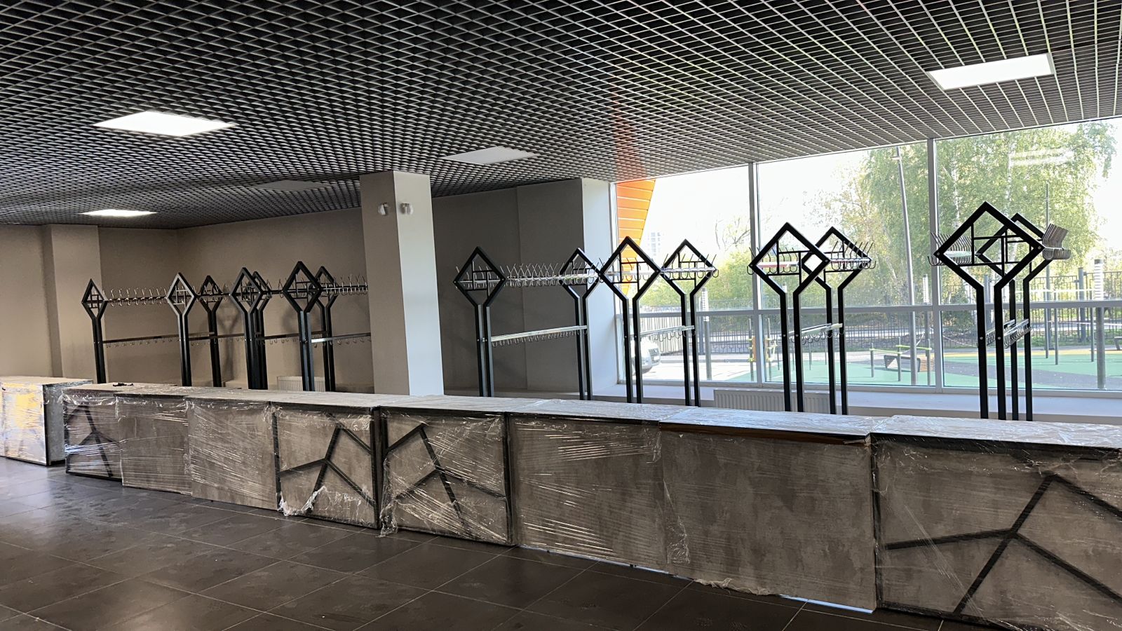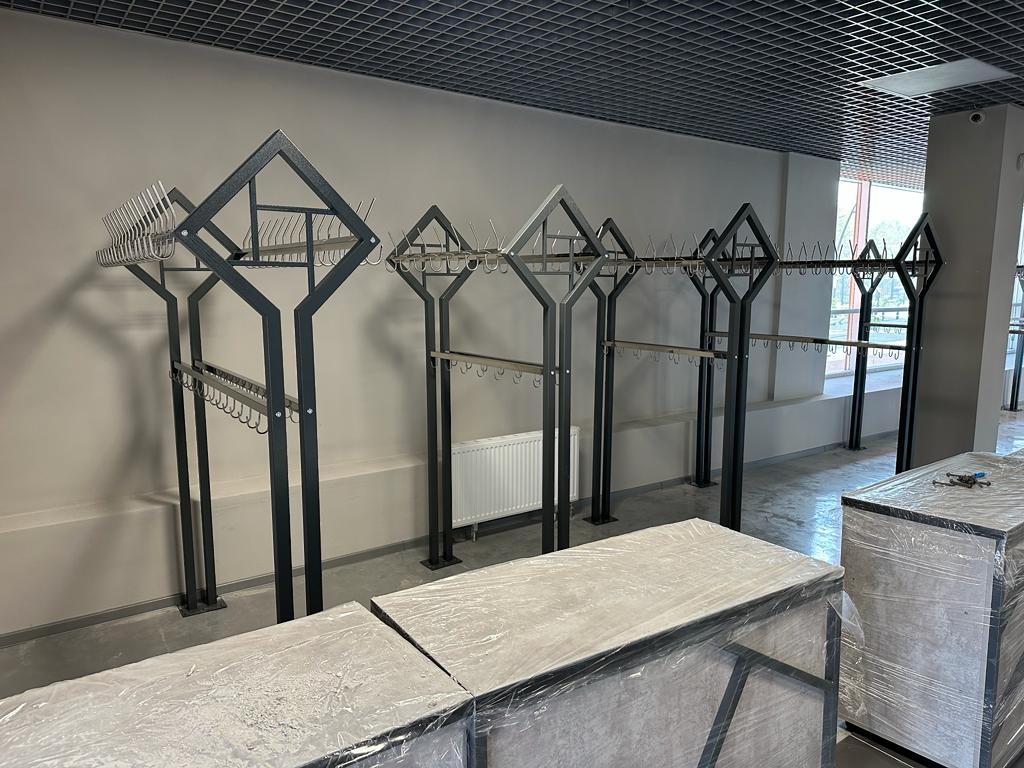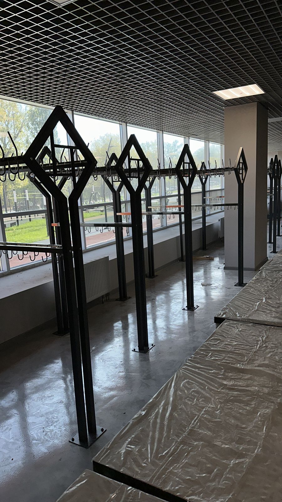 Наша компания поучаствовала в реконструкции физкультурно-оздоровительном комплекса "Спартак" в городе Пермь. Работы были выполнены по индивидуальному проекту. Было укомплектовано 3 помещения. Гардеробные секции выполнены из черного металла с перемычками из нержавеющей стали. На стойках реализован дизайн зоны выдачи. Секция вешалок оборудована двумя рядами (верхний и нижний) крючков. Крючки, расположенные в верхнем ряду позволяют разместить головной убор и предмет верхней одежды. Крючки, расположенные в нижнем ряду, позволяют разместить сумку с обувью. Материал крючков – гладкий прут из нержавеющей стали диаметром верх 8мм., низ - 5 мм.