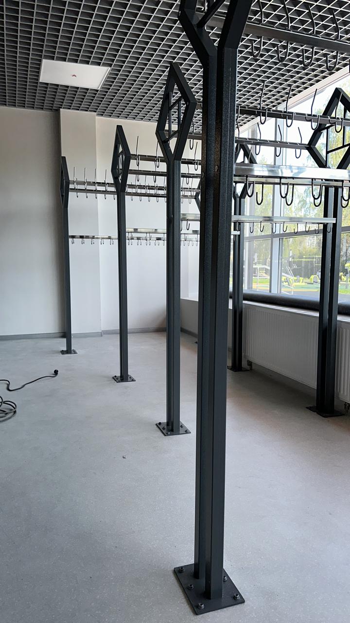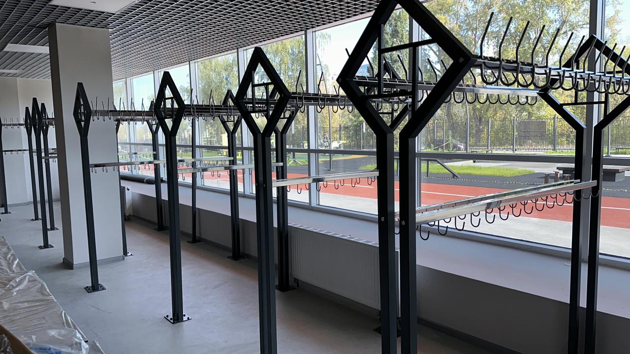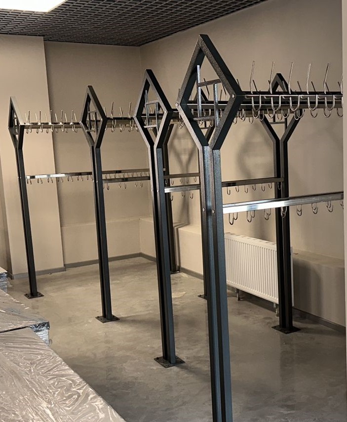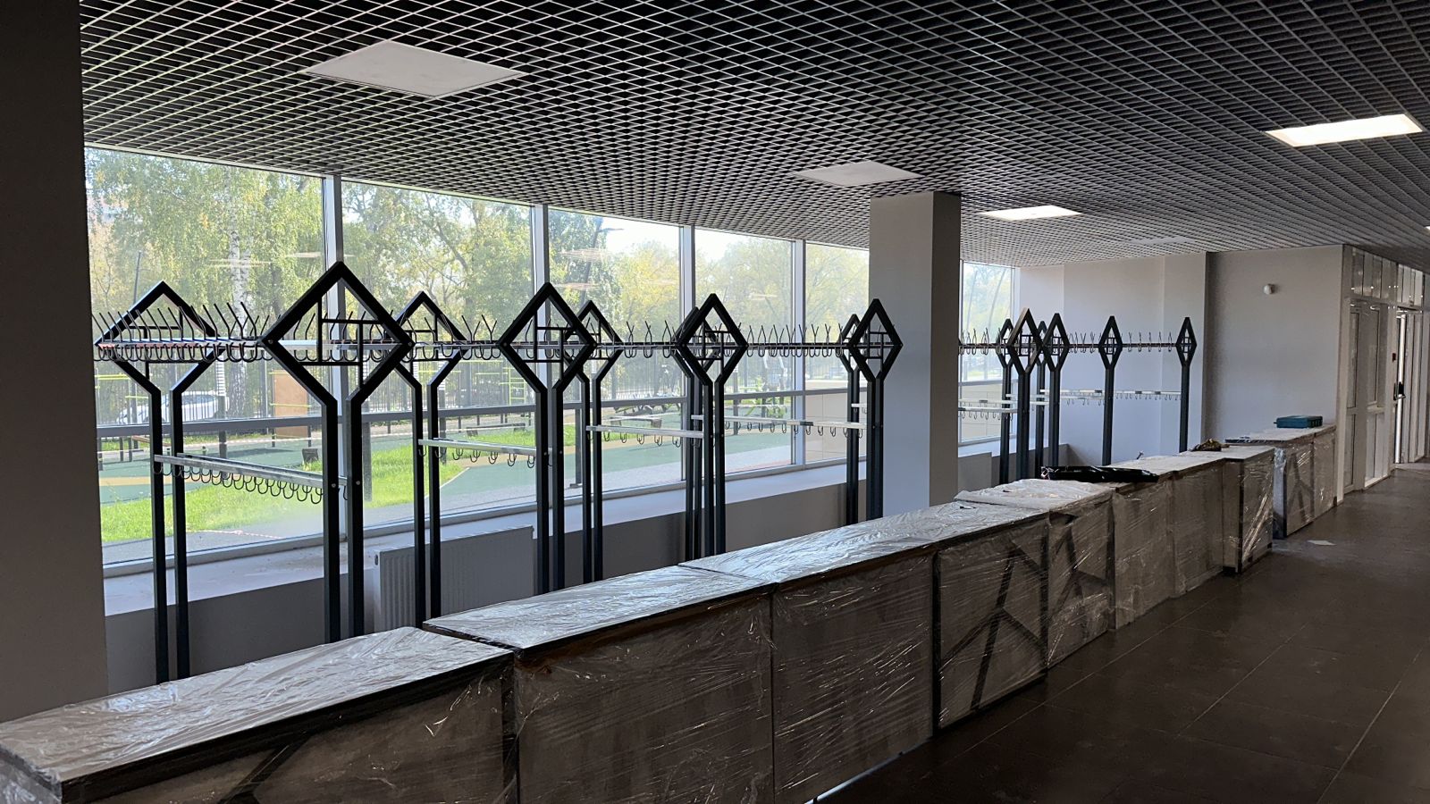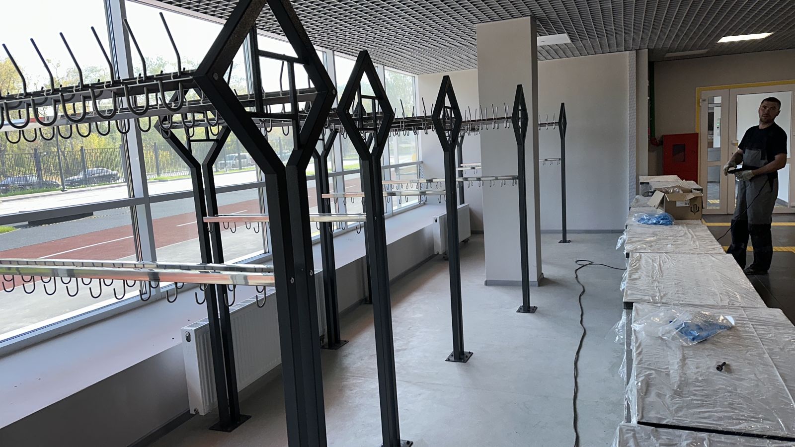 Наша компания поучаствовала в реконструкции физкультурно-оздоровительном комплекса "Спартак" в городе Пермь. Работы были выполнены по индивидуальному проекту. Было укомплектовано 3 помещения. Гардеробные секции выполнены из черного металла с перемычками из нержавеющей стали. На стойках реализован дизайн зоны выдачи. Секция вешалок оборудована двумя рядами (верхний и нижний) крючков. Крючки, расположенные в верхнем ряду позволяют разместить головной убор и предмет верхней одежды. Крючки, расположенные в нижнем ряду, позволяют разместить сумку с обувью. Материал крючков – гладкий прут из нержавеющей стали диаметром верх 8мм., низ - 5 мм.