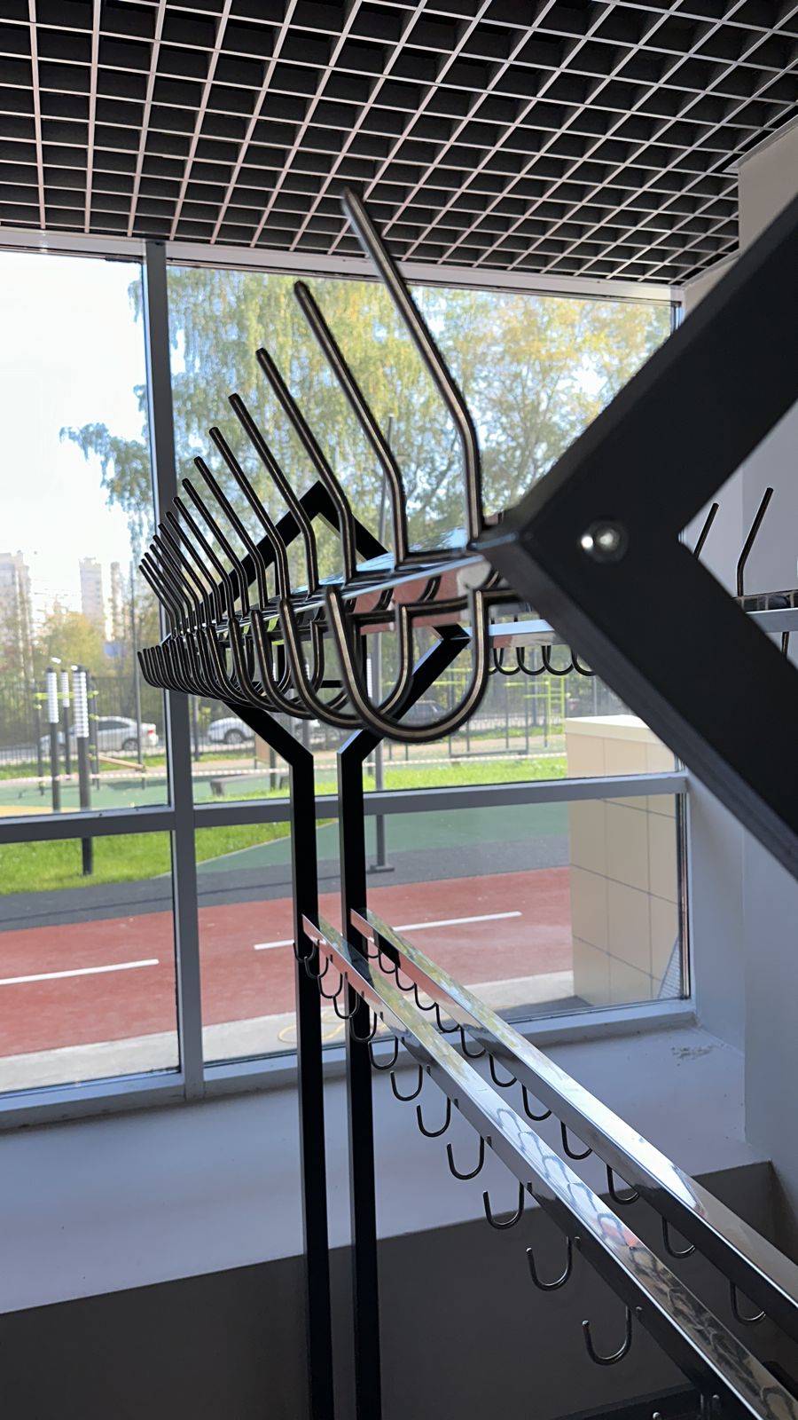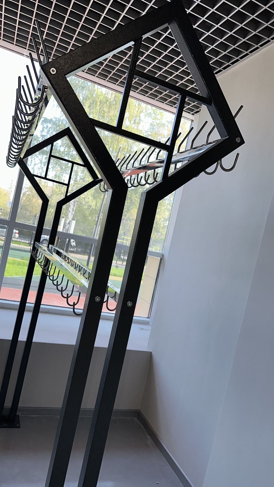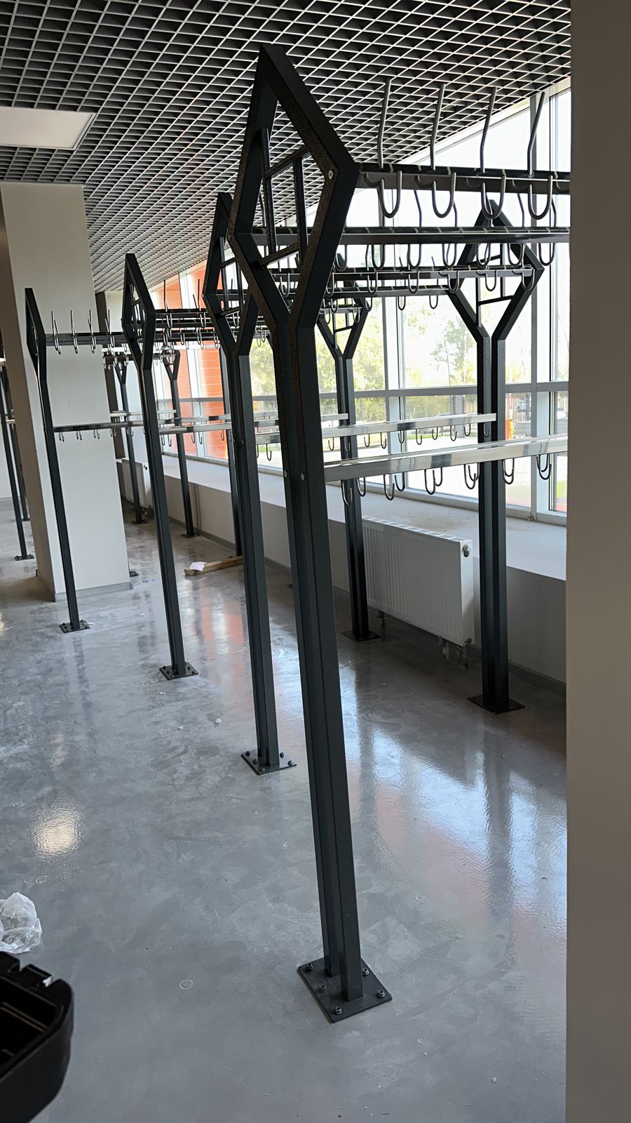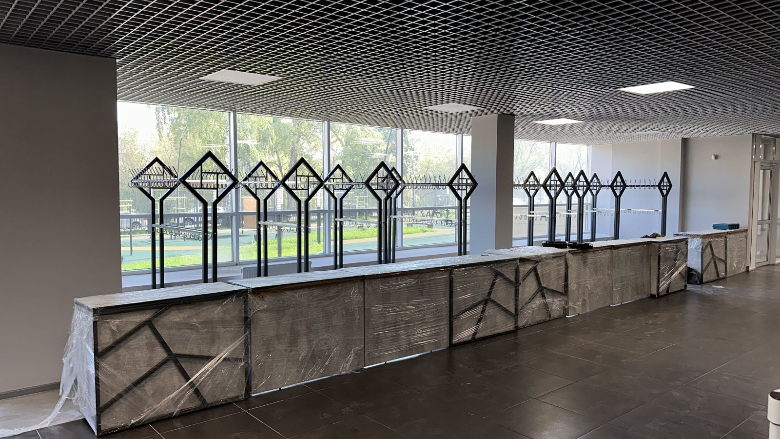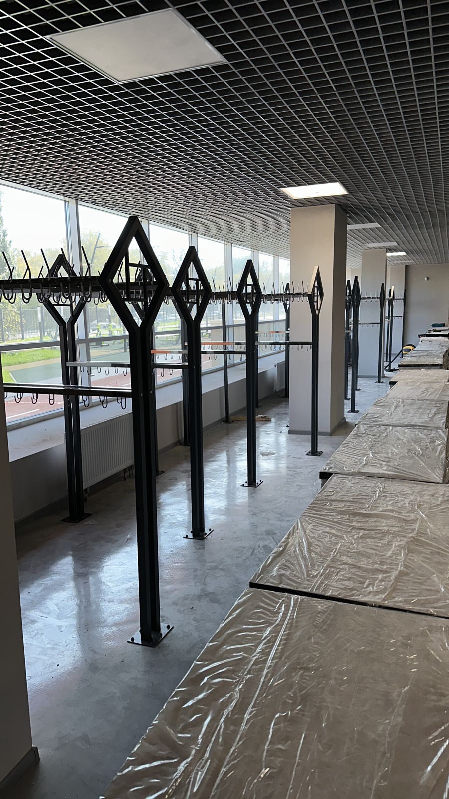Наша компания поучаствовала в реконструкции физкультурно-оздоровительном комплекса "Спартак" в городе Пермь. Работы были выполнены по индивидуальному проекту. Было укомплектовано 3 помещения. Гардеробные секции выполнены из черного металла с перемычками из нержавеющей стали. На стойках реализован дизайн зоны выдачи. Секция вешалок оборудована двумя рядами (верхний и нижний) крючков. Крючки, расположенные в верхнем ряду позволяют разместить головной убор и предмет верхней одежды. Крючки, расположенные в нижнем ряду, позволяют разместить сумку с обувью. Материал крючков – гладкий прут из нержавеющей стали диаметром верх 8мм., низ - 5 мм.