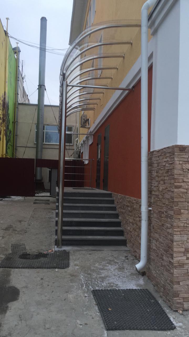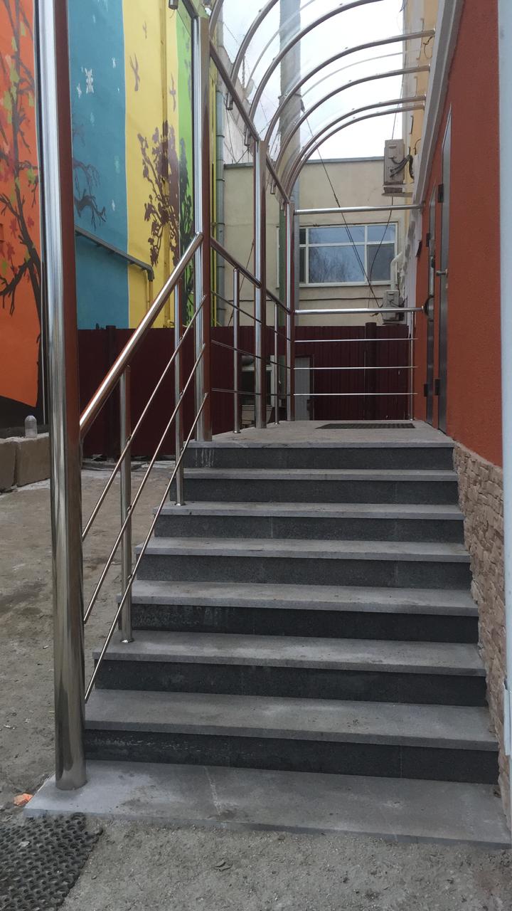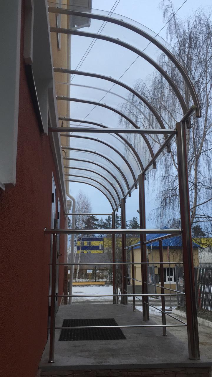Выполнены работы по изготовлению и установке козырька из нержавеющей стали. Труба на столбы использовалась диаметром 100 мм., заполнение на крыше - прозрачный монолитный поликарбонат, толщиной 4 мм. Конструкция получилась светлой, легкой и аккуратной. Так же выполнены работы по установке ограждения из нержавеющей стали, с использованием декоративной фурнитуры.
