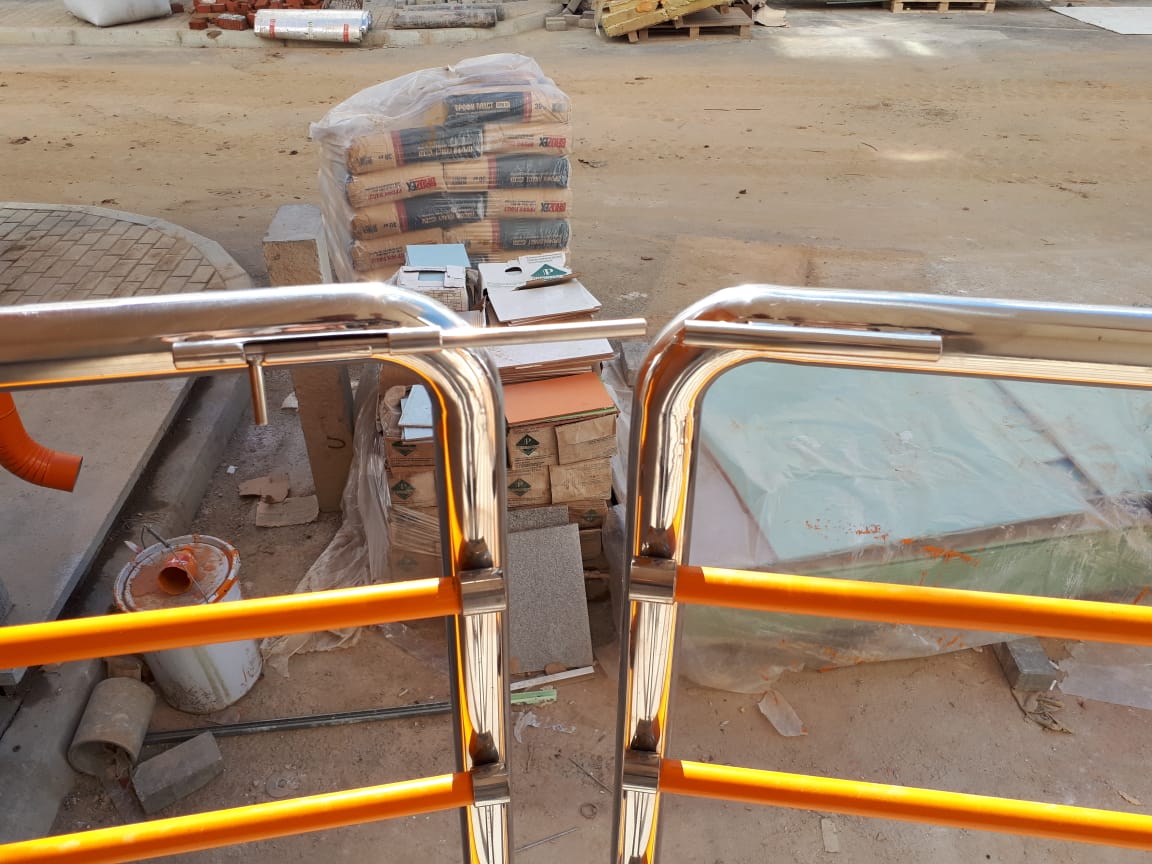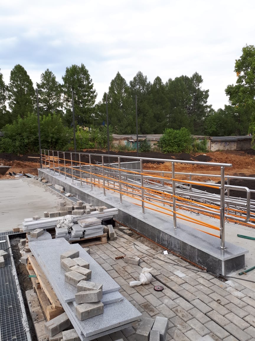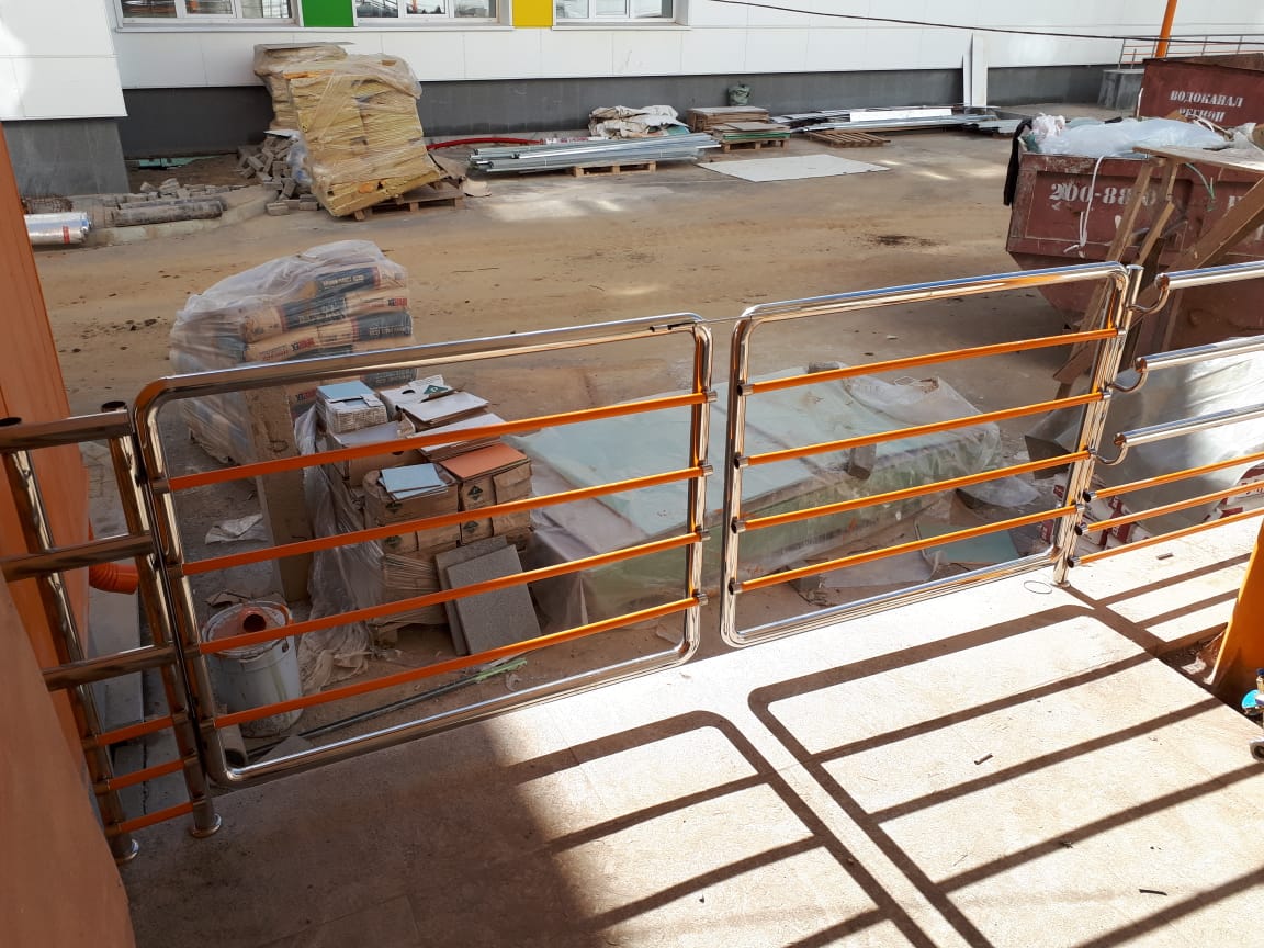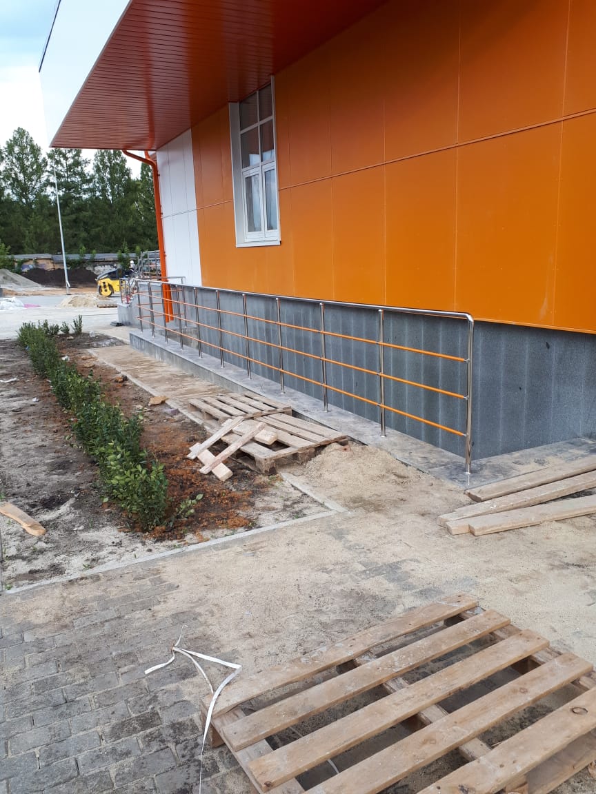 Для здания школы в Верхней Пышме были реализованы: ограждения пандуса, калитка, ограждения по периметру здания. У всех ограждений ригели были окрашены в оранжевый цвет.